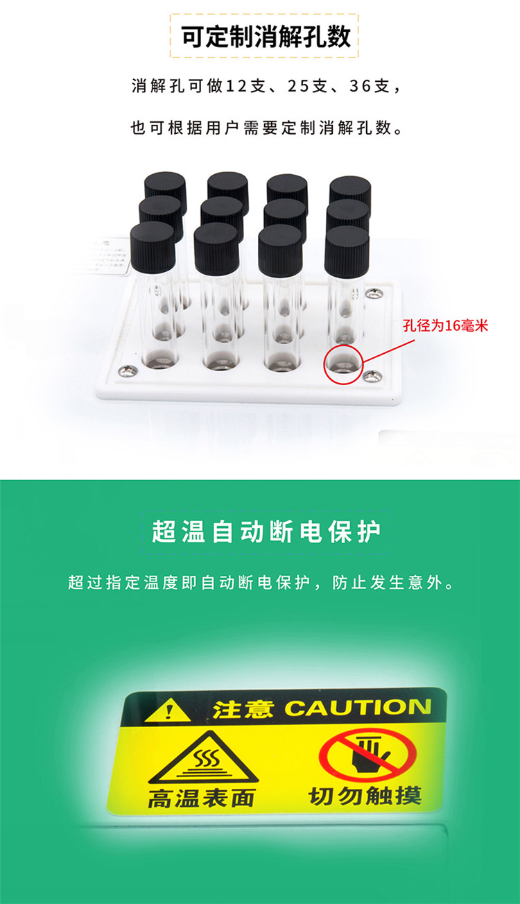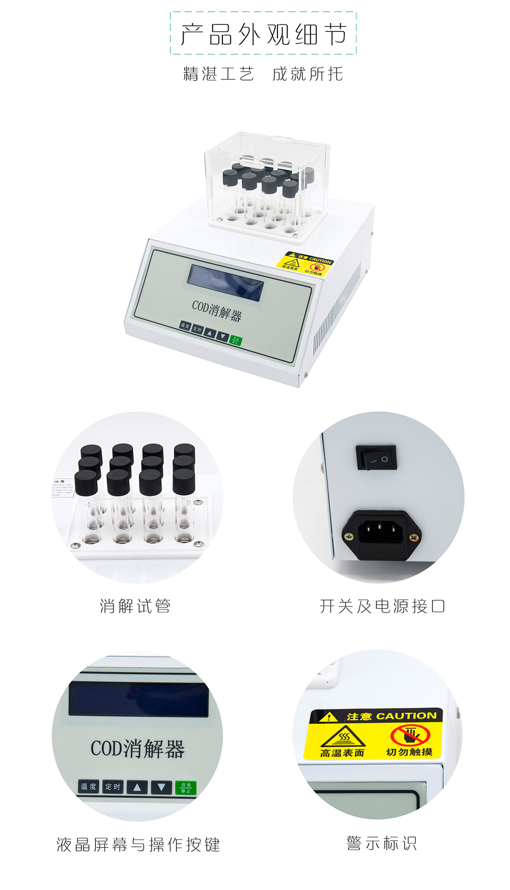 JH-YX系列COD快速消解儀是一種快速測(cè)定化學(xué)耗氧量的加熱裝置。可進(jìn)行COD、總磷、總氮等樣品消解預(yù)處理。該儀器可以自動(dòng)完成恒溫計(jì)時(shí)時(shí)間,時(shí)間設(shè)定1-999分鐘,溫度恒定時(shí)間到達(dá)后儀器具有自動(dòng)聲報(bào)警功能,自動(dòng)關(guān)機(jī),無(wú)需人工參與。溫度漂移小,恒溫精度高。它采用PID溫控器,時(shí)間控制器、升溫速度較快,溫度緩沖小、溫度恒定均勻等特點(diǎn),操作簡(jiǎn)便,是一種實(shí)驗(yàn)手段儀器化產(chǎn)品。同現(xiàn)行的重鉻酸鉀法測(cè)定化學(xué)需氧量的回流裝置相比,具有體積小、節(jié)水、節(jié)電、恒溫性能好等優(yōu)點(diǎn)。適用于加熱快速測(cè)定化學(xué)耗氧量COD,所得數(shù)據(jù)與經(jīng)典方法對(duì)應(yīng),可廣泛用于環(huán)保、高等院校、醫(yī)藥、衛(wèi)生、食品、自來(lái)水、化工、污水處理、造紙、石化、冶金、印染等行業(yè),使COD的示值測(cè)量高效、快速、經(jīng)濟(jì)。