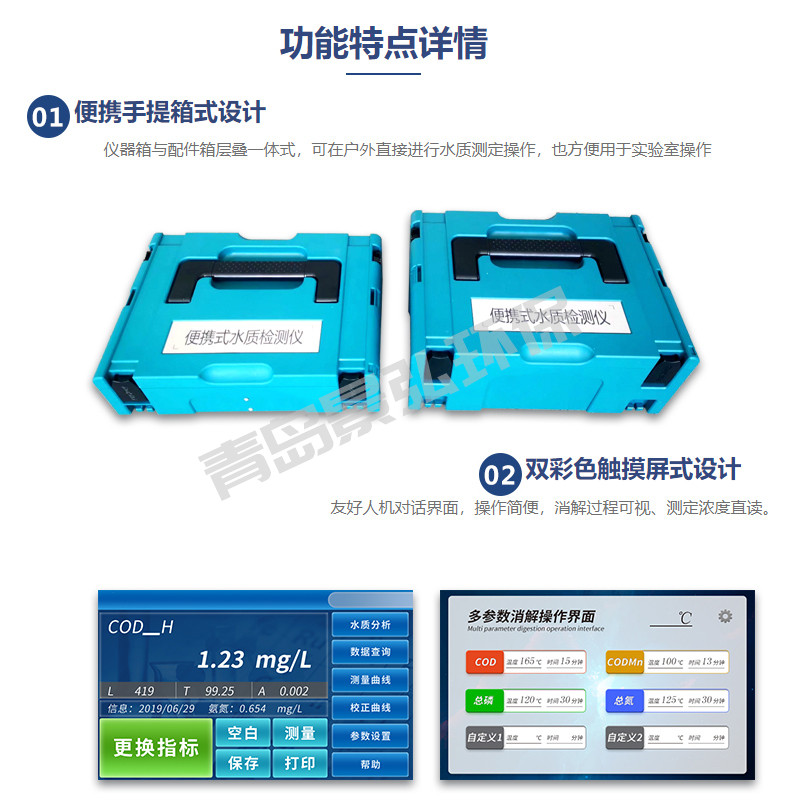 ●便攜手提箱式設(shè)計(jì),儀器箱與配件箱層疊一體式,可在戶外直接進(jìn)行水質(zhì)測(cè)定操作,也方便用于實(shí)驗(yàn)室操作;