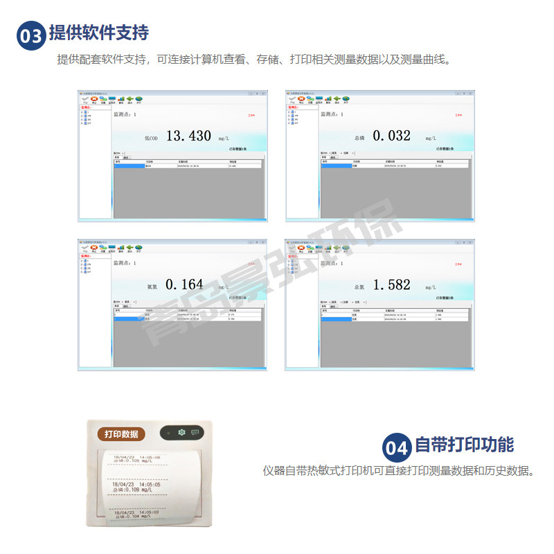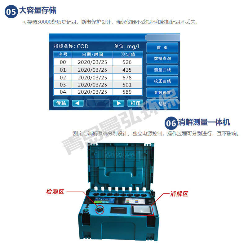 ●儀器內(nèi)置直流電源, 大容量鋰電池供電,可在無(wú)市電的情況下,通過(guò)儀器自身帶的鋰電池,實(shí)現(xiàn)多批水樣加熱消解及比色測(cè)定。