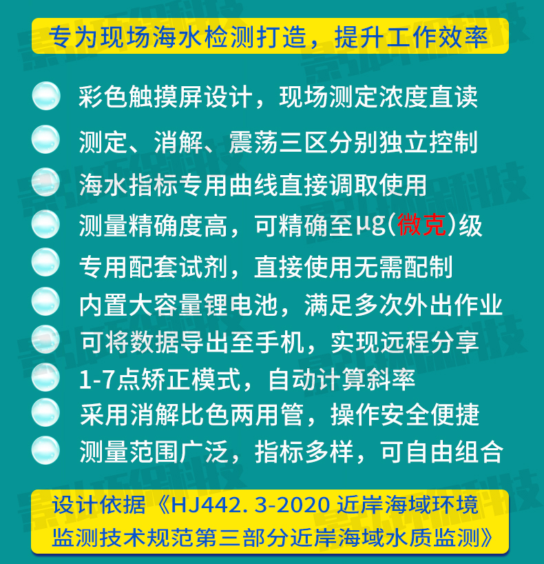 隨著科學(xué)技術(shù)的進步,在光學(xué)、電學(xué)、機械學(xué)、材料學(xué)飛速進步的帶動下,海洋環(huán)境監(jiān)測技術(shù)不斷更新完善,監(jiān)測儀器性能已有大幅提高,但專門用于海水水質(zhì)進行現(xiàn)場監(jiān)測的便攜式儀器并不多見。海水的測定具有被測物含量低、干擾大、鹽度高、現(xiàn)場測定環(huán)境惡劣等特點,普通的水質(zhì)測定儀很難達到海水指標檢測的要求,而精密的測定儀器成本高,測定程序復(fù)雜,測定周期長,很難實現(xiàn)現(xiàn)場的海水測定,針對這一情況,我司技術(shù)研發(fā)人員參照HJ442-2020《近岸海域環(huán)境監(jiān)測技術(shù)規(guī)范》、GB 17378.4-2007《海洋監(jiān)測規(guī)范 第4部分:海水分析》、以及GB3097-1997《海水水質(zhì)標準》等標準中的相關(guān)要求和檢測方法,深入研究,推出可用于實驗室、戶外、監(jiān)測船上的JH-HS800型海水環(huán)境現(xiàn)場監(jiān)測儀,解決了上述測定難點。該儀器測定方法嚴格依據(jù)技術(shù)規(guī)范,將測定設(shè)計的盡量方便、快速、準確,大部分指標可達到微克*含量的測定,幾十種指標的測定只需要一臺儀器就能實現(xiàn),解決了海水現(xiàn)場檢測的難題。